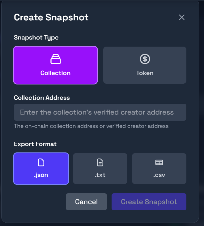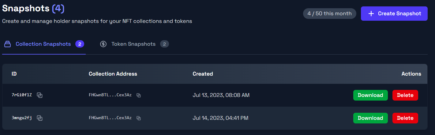 The **Snapshots** tab on the dashboard lets you create, view, and download snapshots of NFT collection or token holders.